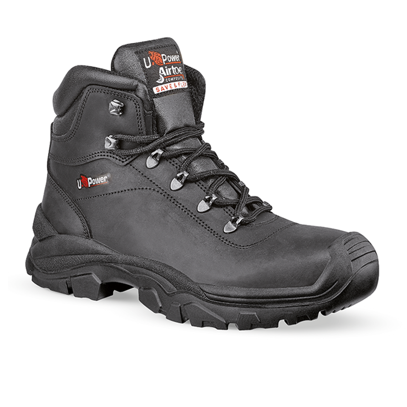 Chaussures de sécurité bottines, confortables et légères avec empeigne en cuir pull-up hydrofuge, hydrofuge, empiècements en mesh réspirant, pointe AirToe Composite, antiperforation, semelle anti-dérapante et PU / PU, S3 SRC