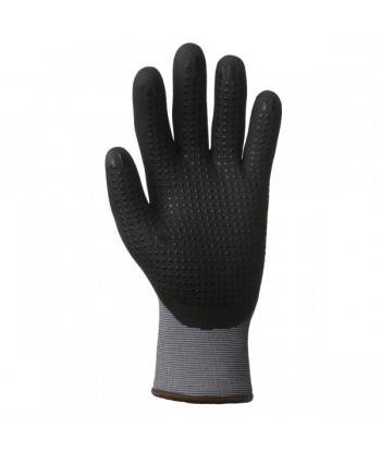 Tricot sans couture en Nylon gris + Spandex de jauge 15. Enduction sur la paume et les ¾ du dos en micro-mousse de nitrile noir + picots sur la paume pour plus de grip. Design ergonomique pour un confort maximum. Respirabilité 360º. Durée de vie prolongée (résistance à l’abrasion niveau 4/4 à la EN 388). Poignet élastiqué pour une meilleure protection contre les salissures. Sans couture pour éviter tous risques d’irritation. Couleurs peu salissantes. Garanti sans silicone.