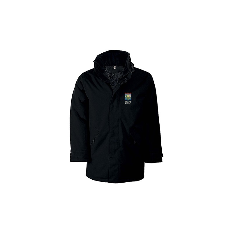 Extérieur : 100% polyester Oxford. Intérieur : polyester matelassé. Fermeture zippée avec patte auto-agrippante et pressions invisibles. 2 poches extérieures zippées. 2 poches intérieures. 1 poche pour téléphone portable. Capuche dans le col. Col doublé polaire. . Grammage : 450 g/m²